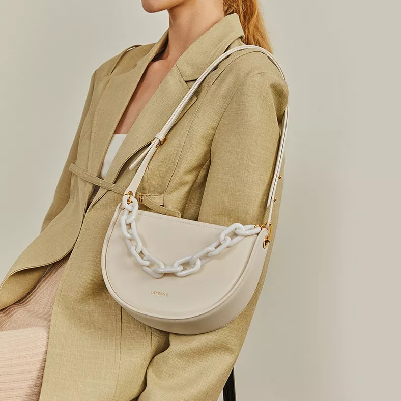 At the heart of its design is a commitment to both aesthetic appeal and practicality. Crafted with high-quality split leather and a durable polyester lining, this purse stands out not just for its beauty but also for its resilience. The unique semi-circle shape, complemented by a chic resin chain decoration, offers a nod to nostalgic elegance while keeping your look modern and fresh.